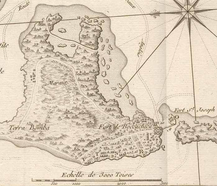 P: Castillo de San Luis de Bocachica V: Batería de Chamba T: Batería de facinas S: Batería de facinas R: Batería de Santiago Q: Batería de San Felipe O: Batería de San José X: Batería de facinas de la Varadera Y: Batería de Punta Abanicos |