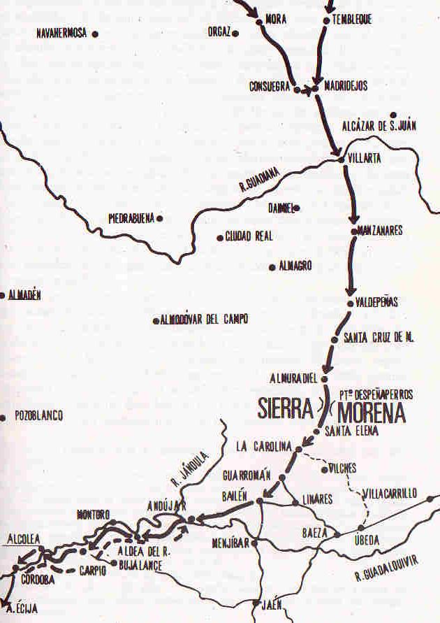 1ª fase, del 23 de mayo al 2 de junio: avance por la Mancha y entrada en Andalucía hasta llegar a Andújar.