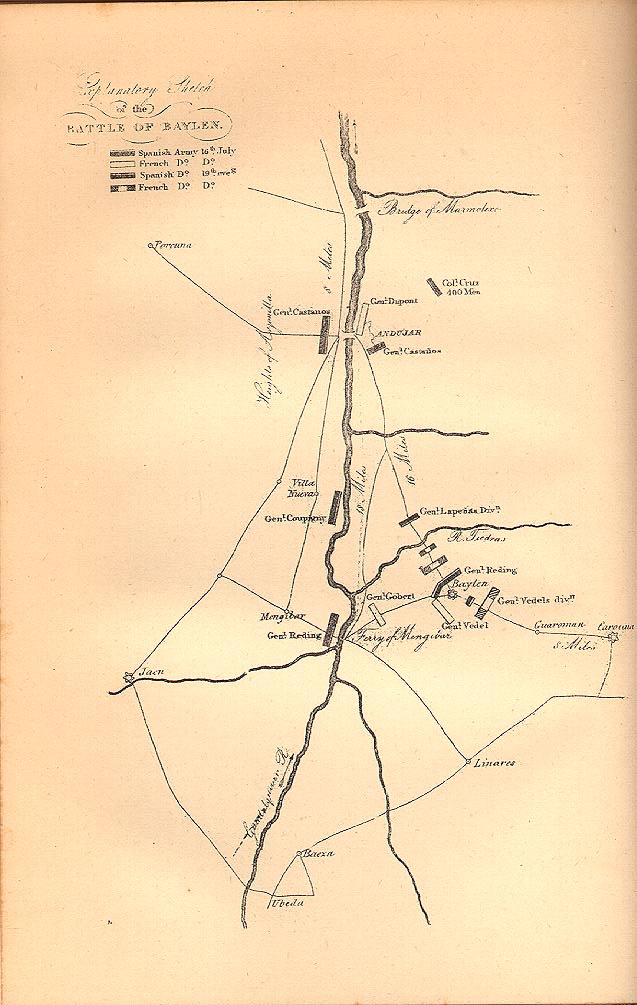 De esta manera, sobre las tres de la madrugada del 19 de julio, la vanguardia de la columna de Dupont tropezó en la oscuridad con las primeras avanzadillas del despliegue dispuesto por el general Réding, dando comienzo la célebre batalla de Bailén.
