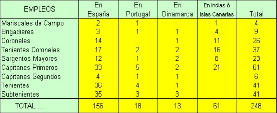 Distribución de los Jefes y Oficiales del Real Cuerpo de Ingenieros en 1808. FUENTE: Memorial de Ingenieros. Mayo de 1908. Año LXIII. Número V. Página 188 El detalle de los destinos en la Península es el que muestra el siguiente cuadro: