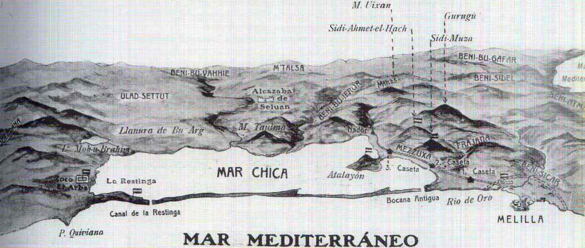 Vista de la zona sur de Melilla, donde se observan las posiciones de El Atalayón, La Restinga, Zoco Er-Arbá, Sidi Hamet, Sidi Musa, 1ª, 2ª y 3ª Casetas, así como la importancia del monte Gurugú, que domina Melilla totalmente, y la situación de Nador y Zeluán.