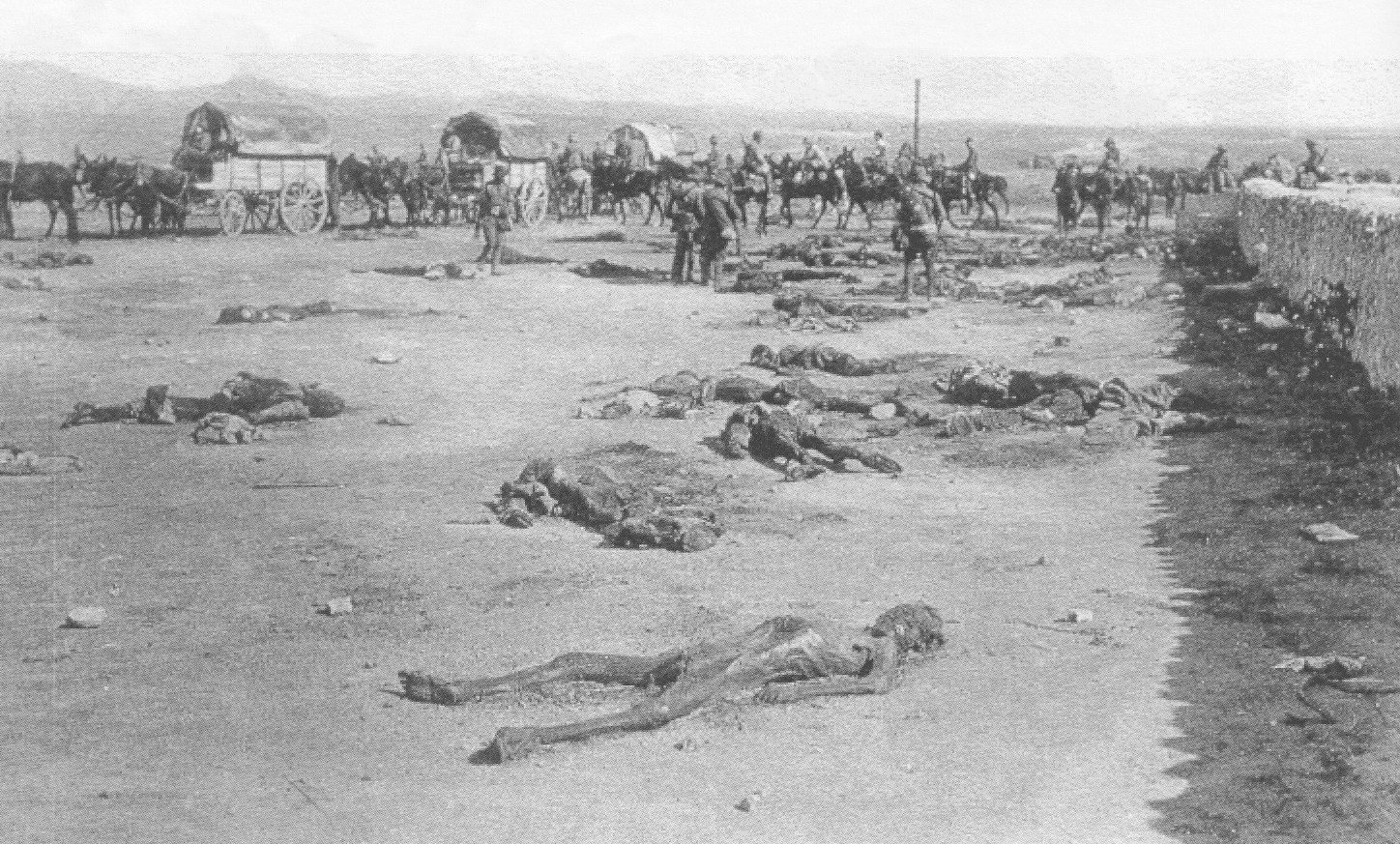 Cadáveres de soldados españoles abandonados en la cuesta de subida a la posición de Monte Arruit. Capellán castrense bendiciendo los cadáveres. Fotos tomadas el 24 de octubre de 1921.