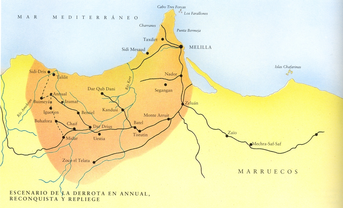 - Annual: 6 compañías se encontraban reunidas en el campamento de Annual, con un total de 1 jefe, 20 oficiales y 491 de tropa.