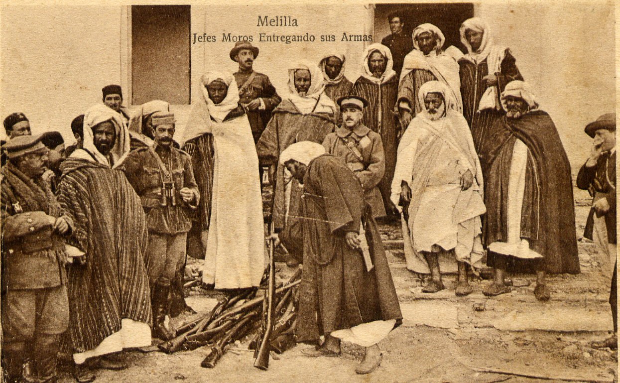 Jefes moros entregando sus armas, con el general Riquelme sentado en medio de ellos, presidiendo el acto. En este enfrentamiento con el general Sanjurjo también tendrá que ver el distinto proceder de uno y otro de cara a la reconquista del territorio perdido por España en julio. Riquelme abogará por la "acción política" que era una mezcla de negociaciones y sobornos a los líderes de las cábilas que ahorrará muchas vidas de soldados españoles. Sobre la actuación de Riquelme durante la reconquista del territorio perdido leemos en el extracto de su biografía, publicada el el BOE del 26 de febrero de 1924 con motivo de su ascenso a general de Brigada: Tomó parte activa en numerosas operaciones de campaña efectuadas mandando columnas y logró, por la eficaz y enérgica labor política desarrollada, el rescate de más de 300 prisioneros entre militares y paisanos y la sumisión y desarme de varias kabilas. A mediados de 1922, el enfrentamiento con el Comandante General llegó a su máximo y el coronel Riquelme es cesado de su mando en Melilla; no obstante, no abandonó del todo su amada África, pues en 1924 participó en la reconquista de Tetuán.