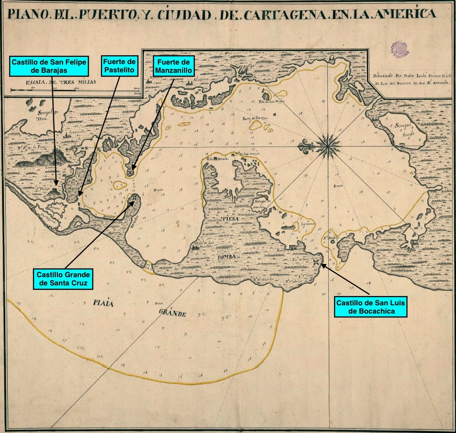 Tras este fracaso inicial por desconocimiento del terreno, el almirante Vernon se vió obligado a atacar Cartagena de Indias desembarcando sus tropas desde el interior de la bahía, y para ello debía forzar el paso del canal de Bocachica.
