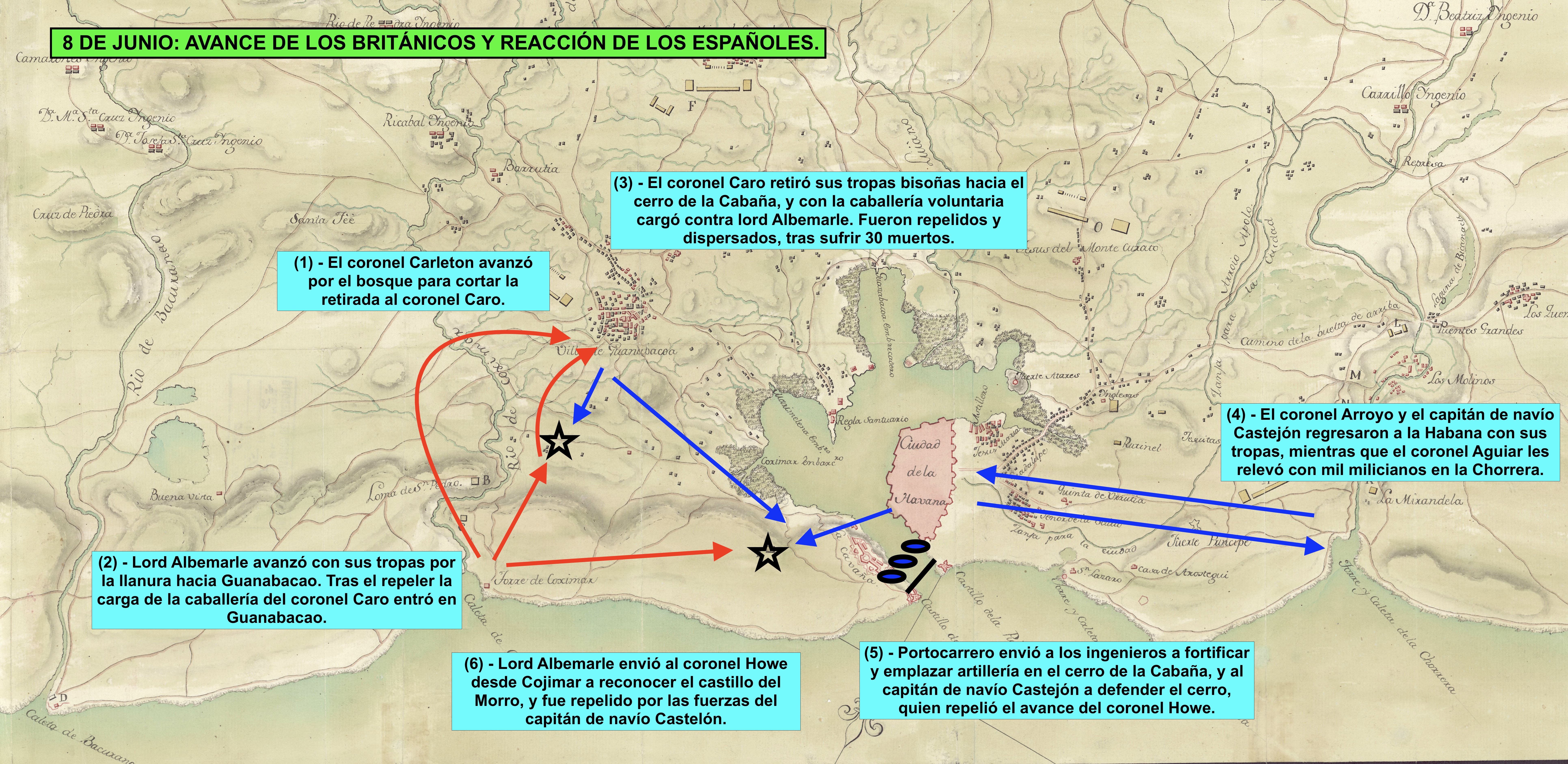 Al amanecer del 8 de junio, lord Albemarle ordenó al coronel Carleton que avanzase con su unidad por el bosque hacia Guanabacoa para cortar la retirada al cuerpo español del coronel Caro allí apostado, mientras él avanzaba por la llanura: