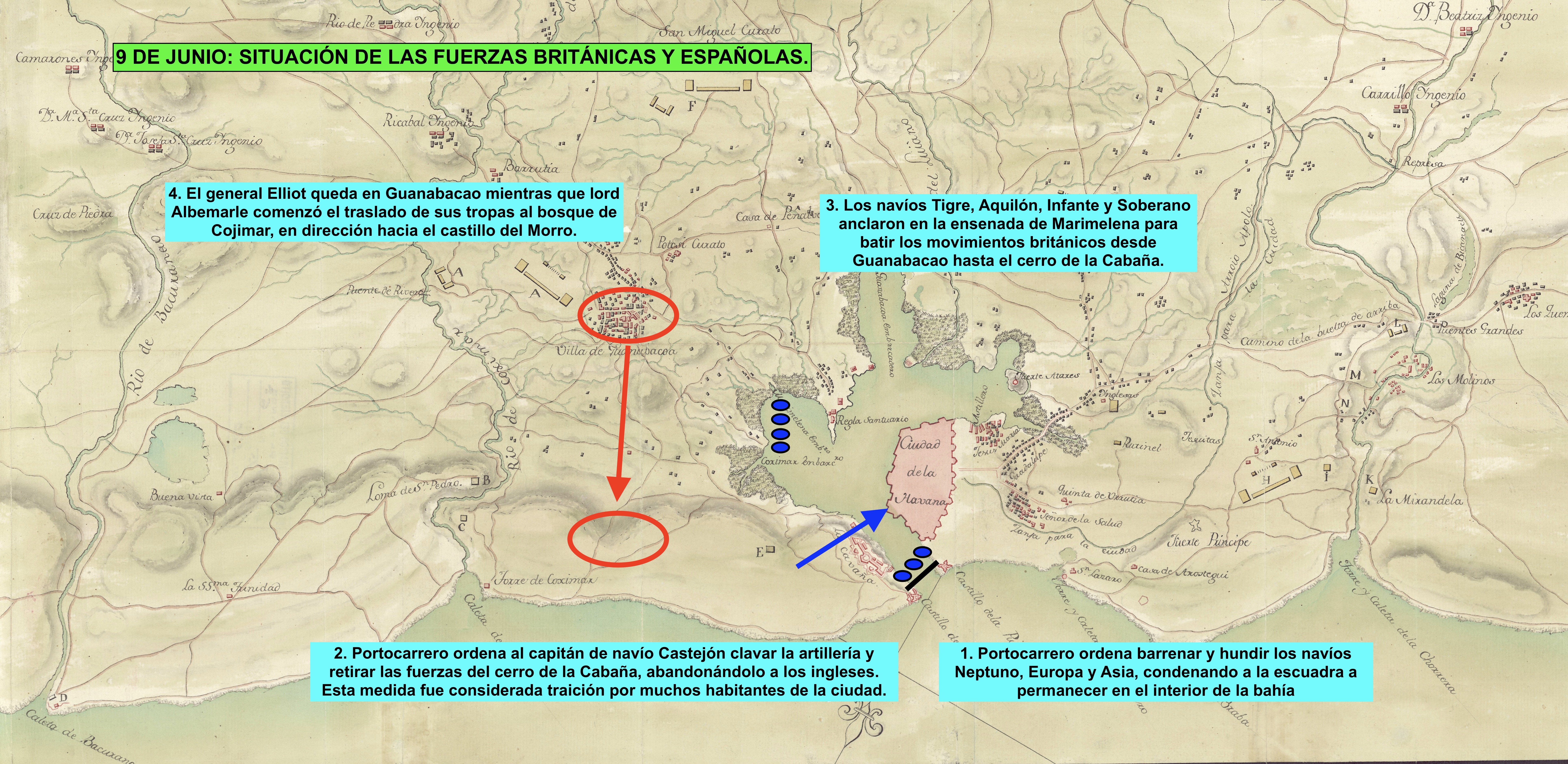 Ese día lord Albemarle comenzó a llevar sus tropas de Guanabacoa para acampar con ellas en el bosque existente entre Cojimar y la fortaleza del Morro, mientras dejaba el pueblo a su segundo, el teniente general Elliot, con una pequeña guarnición. También ese día los navíos Tigre, Aquilón, Infante y Soberano anclaron en la ensenada de Marimelena para batir con sus cañones los movimientos británicos desde Guanabacao hasta el cerro de la Cabaña.