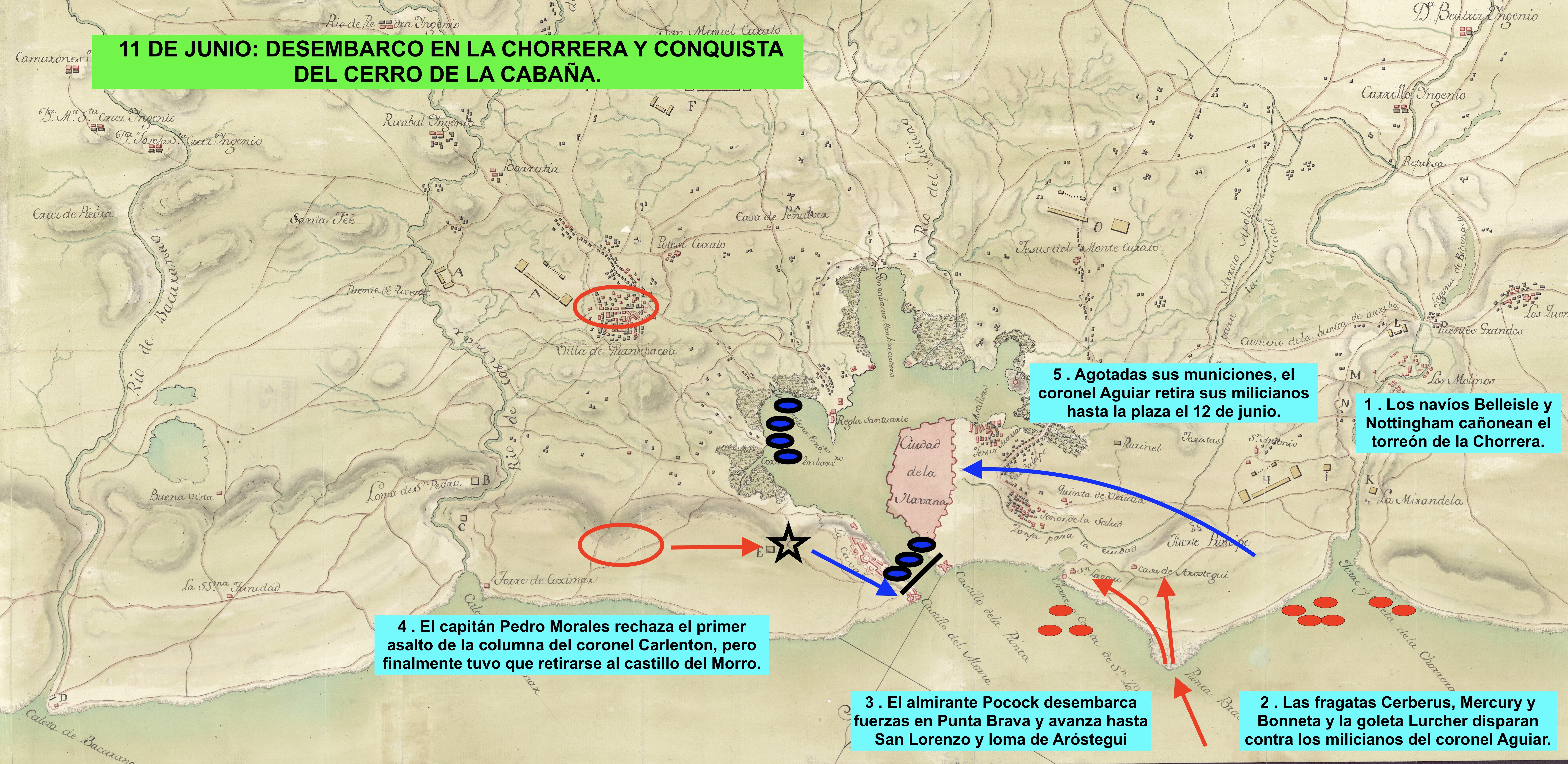 Mientras se realizaba el bombardeo naval sobre la Chorrera, el almirante Pocock desembarcó con un improvisado cuerpo de marineros en Punta Brava, a unos escasos 3,5 km al oeste de la Habana. Poco después, esta cuerpo británico avanzó hasta la loma de San Lorenzo, se atrincheró en ella y levantó un campamento. Días después de apoderó también de la loma de Aróstegui[11]. Por la noche, tres bombardas lanzaron los primeros proyectiles sobre la ciudad de la Habana, protegidas por los navíos Edgar y Stirling Castle y la fragata Echo.