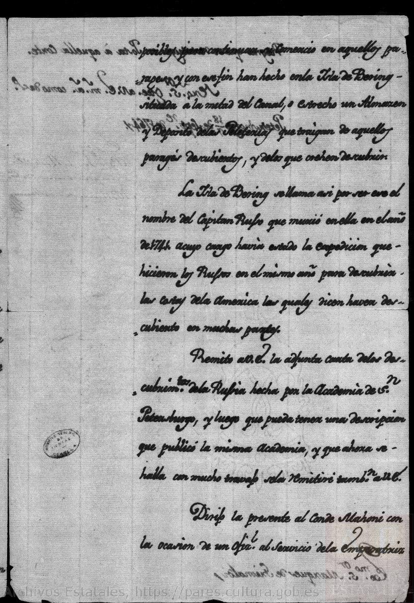 Mui Sr. mio: Con fecha 30 de Marzo del presente año participe a V.E. los progresos de los Descubrimientos de la Rusia acia la América, y no pudiendo yo mirar con indiferencia ni ese punto ni otro alguno que tenga algún respecto a los Intereses del Rey Ntro. Sr. y cumpliendo de mi obligación, he procurado el averiguar quenato me ha sido posible: en cuya consequencia devo decir que tienen mucha verosimilitud las relaciones de los Mercaderes Rusos de que hice mención en mi citada carta, pues desde mucho tiempo se ha hecho la observación que las Zorras no tienen el pelo negro en su xxx del Grado 60 de Latitud, y las que ellos dijeron de las Islas referidas (a quienes han puesto el nombre de Aleyut) son muy negras: estos antecedentes han hecho nacer en este Govierno un vivo deseo de adelantar los descubrimientos y así ha determinado que se haga una expedición para atravesar el Estrecho que separa la America de a Syberia con la mira de cercirarse también de los dichos descubrimientos.