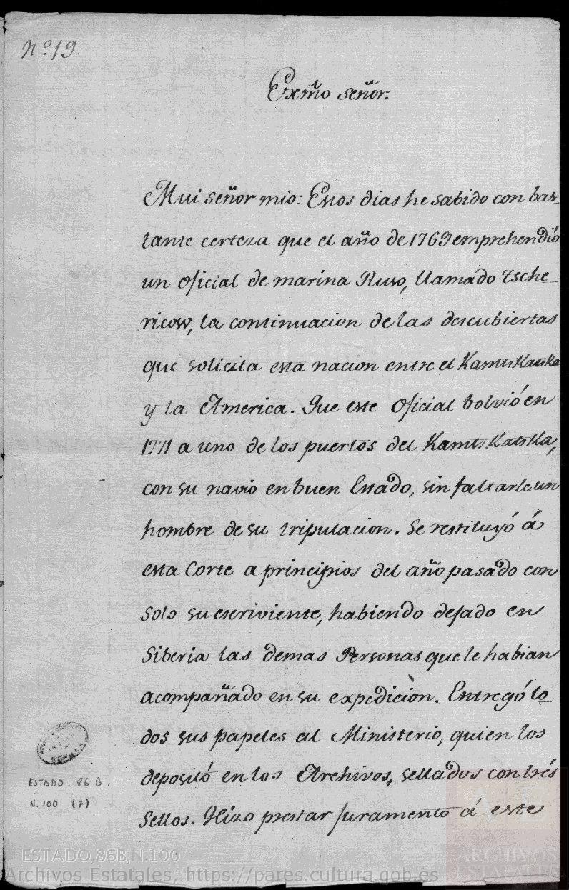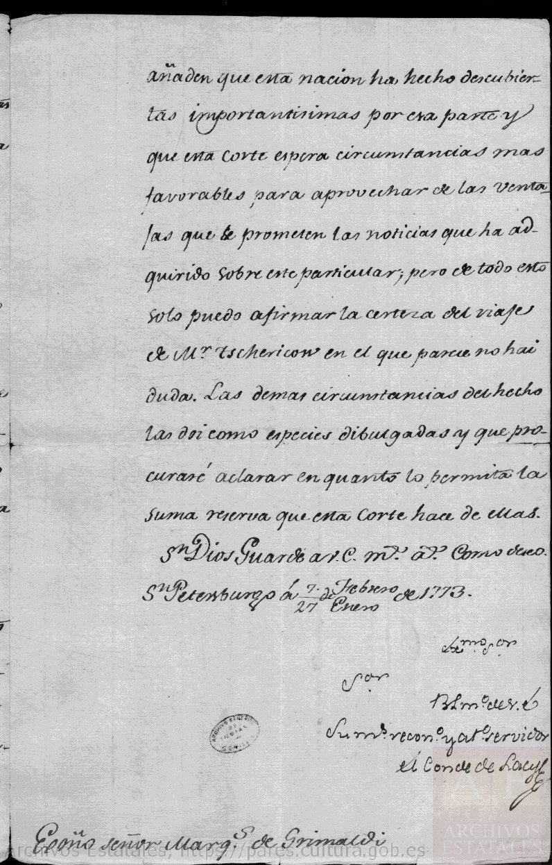 Mui señor mío: Estos días he sabido con bastante certeza que el año de 1769 emprehendió un oficial de marina Ruso, llamado Tschricow, la continuación de las descubiertas que solicita esta nación entre el Kamtschatka y la América. Que este Oficial bolvió en 1771 a uno de los puertos del Kamtschatka, con su navío en buen estado, sin faltarle un hombre de su tripulación. Se testituyó a esta Corte a principios del año pasado con solo su escriviente, habiendo dejado en Siberia las demás Personas que le habían acompañado en su expedición. Entregó todos sus papeles al Ministerio, quien los depositó en los Archivos, sellados con tres sellos. Hizo prestar juramento a este Oficial y a su escriviente deguardar el silencia más profundo sobre sus descubiertas y se dió al primero el mando de la última esquadra que se ha embiado de aquí al Archipiélago.