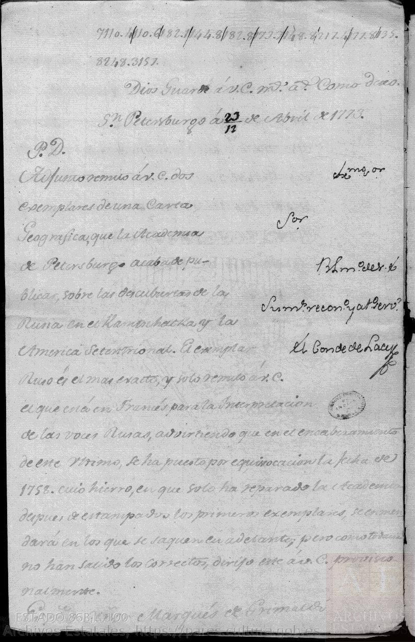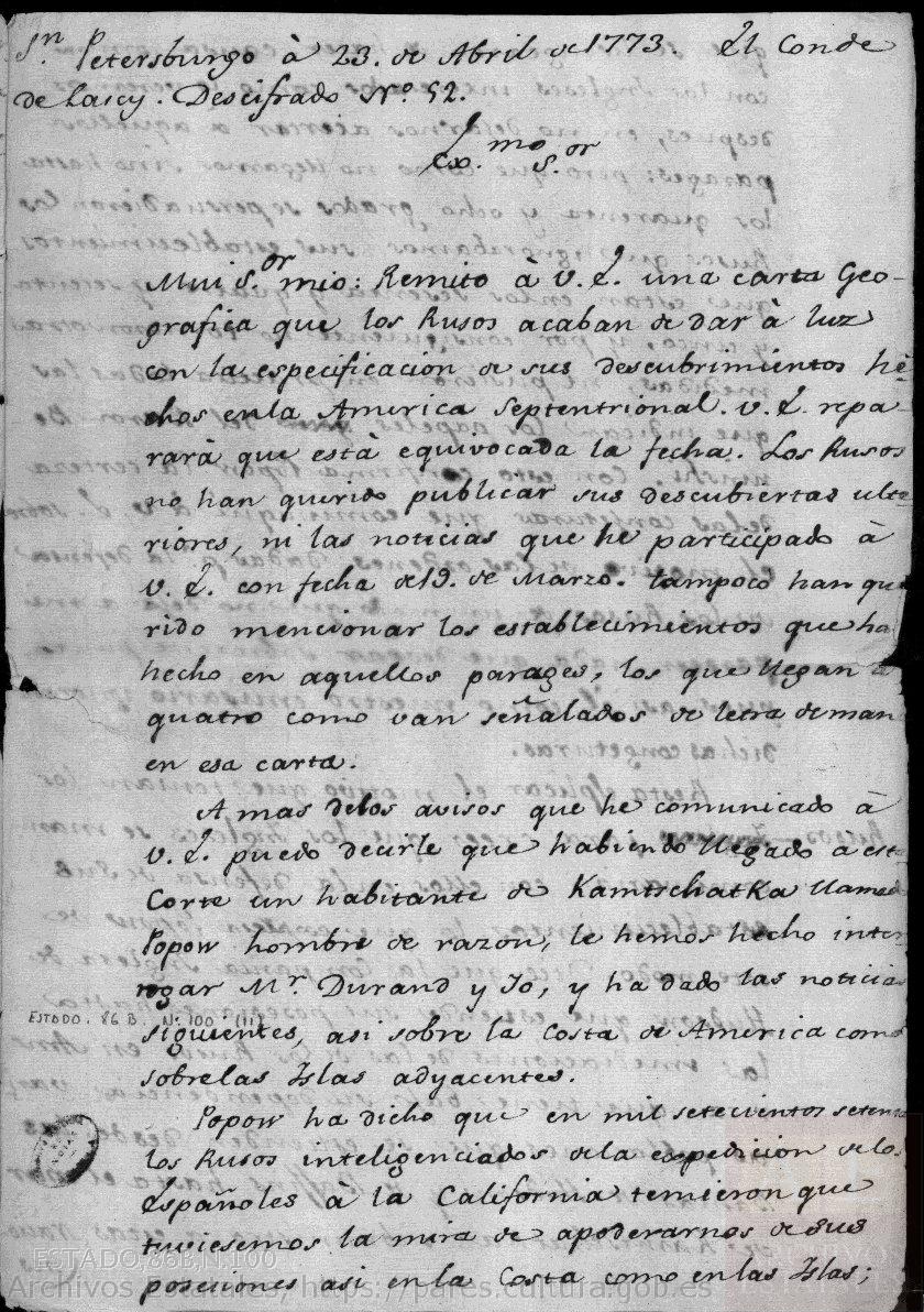 Carta nº 52 de don Francisco Antonio de Lacy, conde de Lacy, al marqués de Grimaldi, secretario de Estado, remitiendo un mapa y dando cuenta de las noticias adquiridas por un comerciante de Kamtschatka llamado [Fedor Laekséyev] Popov relativas a los establecimientos rusos en América, fechada el 23 de abril de 1773.