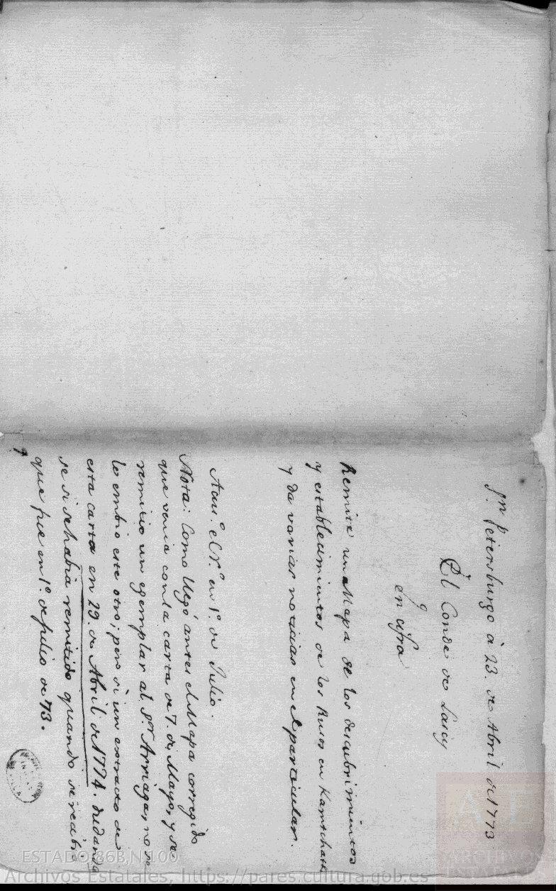 Mui señor mío: Remito a V.E. una carta Geográphica que los Rusos acaban de dar a luz con las especificaciones a sus descubrimientos hechos en la América Septemtrional. V.E. reparará que está equivocada la fecha. Los Rusos no han querido publicar sus descubrimientos anteriores, ni las noticias que he participado a V.E. con fecha de 19 de Marzo. Tampoco han querido mencionar los establecimientos que han hecho en aquellos parages, los que llegan a quatro como van señalados de letra de mano en esa carta.