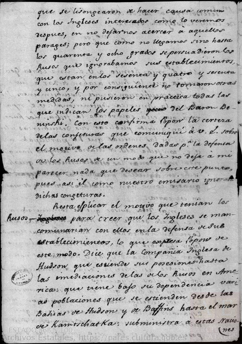 Popow ha dicho que en mil setecientos setenta los Rusos inteligenciados de la expedición de los Españoles a la California temieron que tiviesemos la mira de apoderarnos de sus posesiones en la Costa como en las Islas, que se lisongearon de hacer causa común con los Ingleses interesados como lo vertemos después, en no dejarnos acercar a aquellos parages; pero que como no llegamos sino hasta los quarenta y ocho grados se persuadieron los Rusos que ignorábamos sus establecimientos, que están en los sesenta y quatro y sesenta y cinco, y por consiguiente no tomaron otras medidas, ni pusieron en práctica todas las que indican los papeles del Barón Beninski. Con esto confirma Popow la certeza de las conjeturas que comuniqué a V.E. sobre el motivo de las órdenesn dadas para la defensa de los Rusos de un modo que no deja a mi parecer nada que desear sobre este punto, pues así él como nuestro emisario ignoran dichas congeturas.