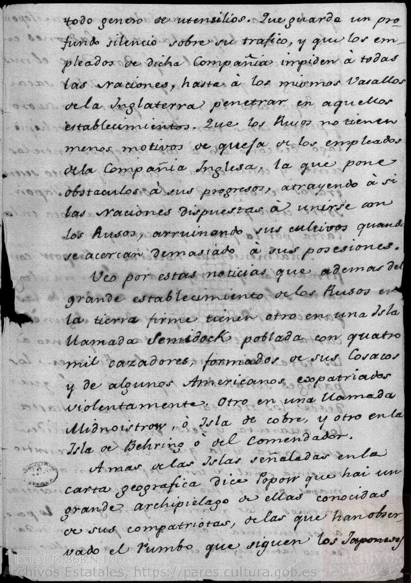 Veo por estas noticias que además del grande establecimiento de los Rusos en la tierra firme tienen otro en una Isla llamada Semidock poblada con quatro mil cazadores, formados de sus Cosacos y de algunos Americanos expatriados violentamente. Otro en una llamada Midnoistrow, o Isla de Cobre, y otro en la Isla de Behring o del Comendador.