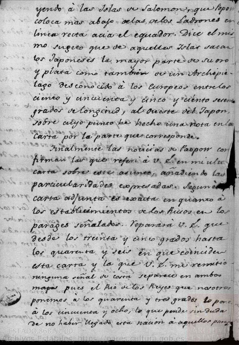 Además de las Islas señaladas en la carta geográfica, dice Popow que hai un grande archipiélago de ellas conocidas de sus compatriotas, de las que han observado el rumbo que siguen los Japoneses yendo a las Islas de Dalomón, que Popow coloca más abajo de las de los Ladrones en línea recta acia el equador. Dice el mismo sugeto que de aquellas Islas sacan los Japoneses la mayor parte de su oro y plata, como también de un Archipiélago desconocido a los europeos entre los ciento y cincuenta y cinco y ciento y sesenta grados de longitud, al Oueste del Japón, sobre cuyo punto he hecho una nota en la carta por la parte que corresponde.