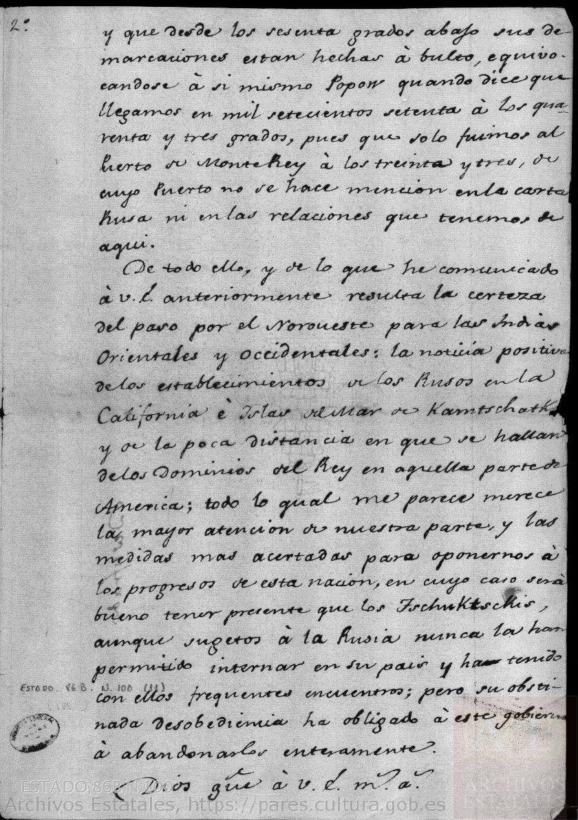 De todo ello, y de lo que he comunicado a V.E. anteriormente resulta la certeza del paso por el Noroueste para las Indias Orientales y Occidentales: la noticia positiva de los establecimiento de los Rusos en la California e Islas del Mar de Kamtschatka y de la poca distancia en que hallan de los dominiso del Rey en aquella parte de América; todo lo qual me parece merece la mayor atención de nuestra parte, y las medidas más acertadas para oponernos a los progresos de esta nación, en cuyo caso será bueno tener presente que los Tschuktsckis, aunque sugetos a la Rusia, nunca la han permitido internar en su país y han tenido con ellos frequentes encuentros; pero su obstinada desobediencia ha obligado a este gobierno a abandonarlos enteramente.