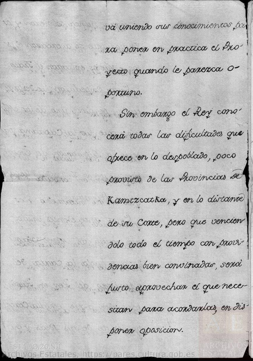 Estos antecedentes, unidos a la noticia de Nuevo Viaje de que habla la carta del Ministro del Rey en Rusia, persuaden a que aquella Corte no desiste de sus ideas, y que va uniendo sus conocimientos para poner en práctico el Proyecto quando le parezca oportuno. Sin embargo, el Rey conocerá todas las dificultades que ofrece en lo despoblado, poco provisto de las Provincias de Kamtzcatka, y en lo distante de su Corte, pero que venciéndolo todo en tiempo con providencias bien convinadas, será justo aprovechar el que necesitan para acordarlas, en disponer oposición.