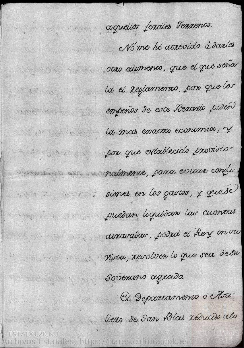 No me he atrevido a darles otro aumento, que el que señala el Reglamento, por que los empeños de este Herario piden la mas exacta economía, y por que establecido provisionalmente, para evitar confusiones en los gastos, y que se puedan liquidar las cuentas atrasadas, podrá el Rey en su vista, resolver lo que sea de su soverano agrado.