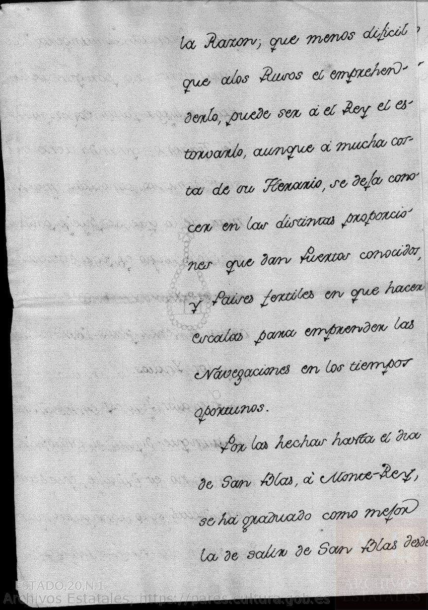 Esto me hace creer, que saliendo de Monte-Rey por el mismo tiempo, podrán adelantar el reconocimiento de la Costa sin mayor incomodidad, y que quando la encuentren, como que dejan Puertos a Sotavento donde arrivar, tendrán alivios en sus trabajos.