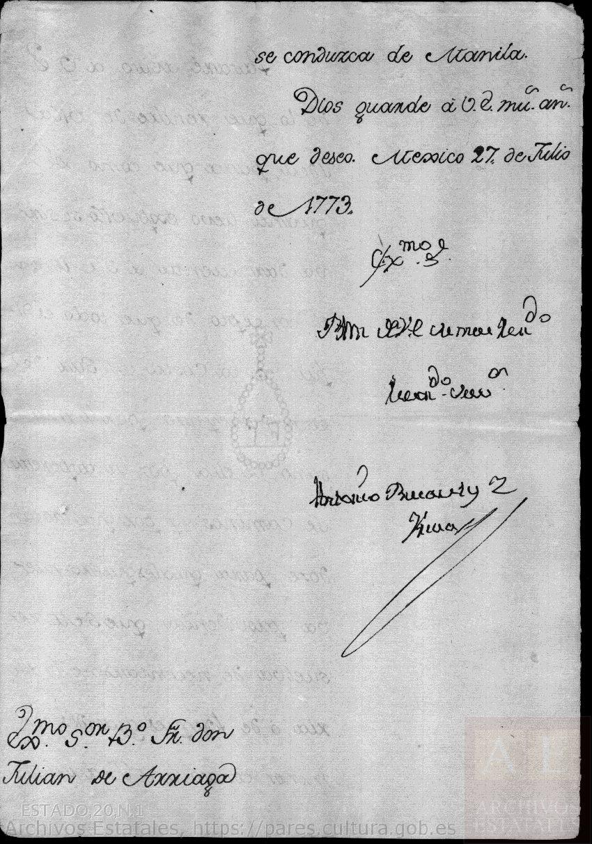 Dios guarde a V.E. muchos años que deseo. Mexico 27 de Julio de 1773.