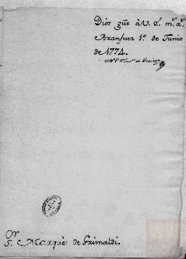 Acceso al fichero PDF Acuse de recibo de don Julián de Arriaga de los documentos enviados, de 1 de junio de 1774..