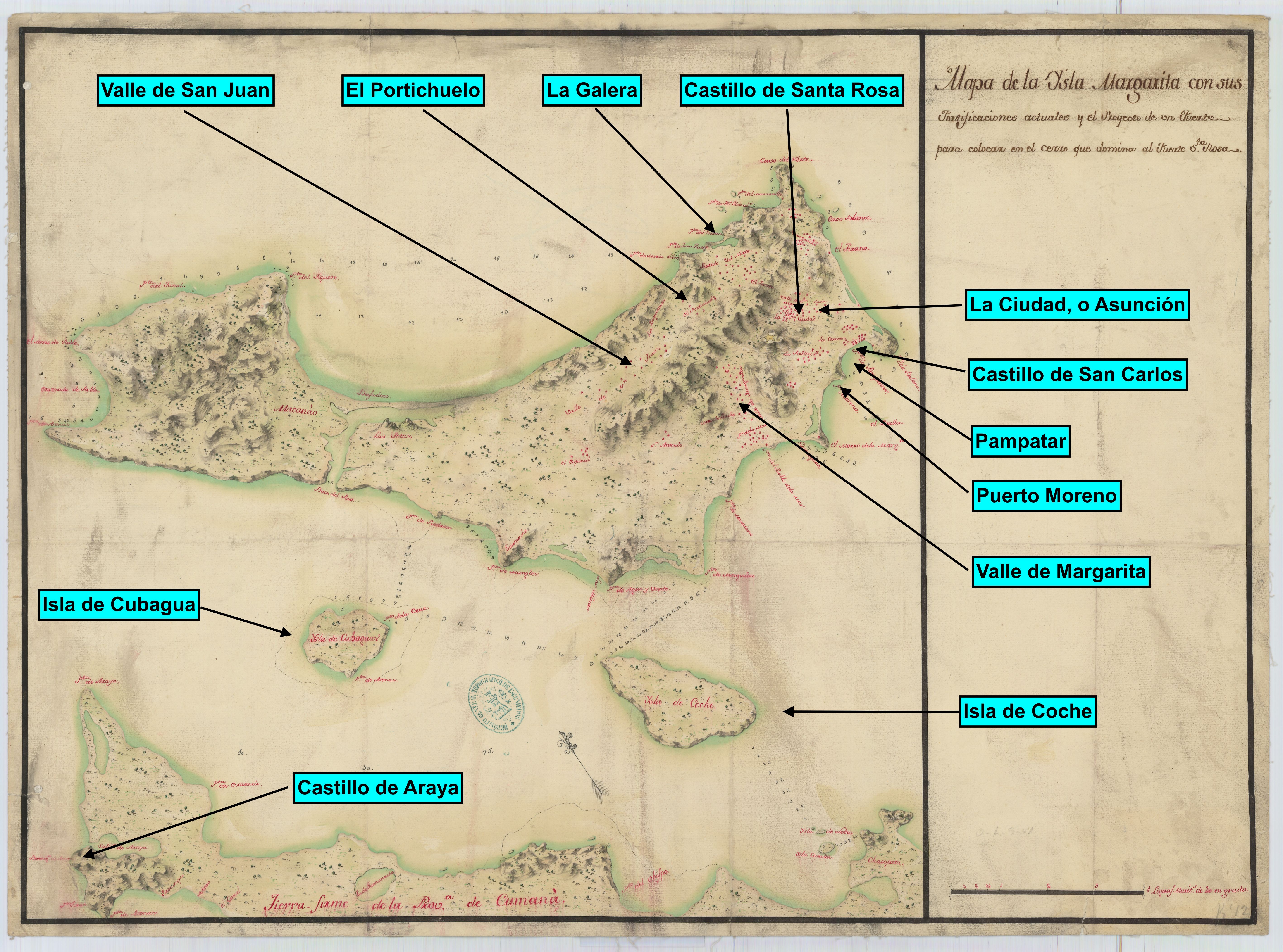 9º … Por todas partes exceptuando las del Este, es accesible esta Isla: pero los parajes de mayor recelo son el Puerto de Pampatar en el Sud y el de la Galera en el Norte; y como las precauciones que se tomen en el uno, pueden aplicarse para el otro, y el primero es el principal, se establecerá el plan de Defensa con consideración a que será aquel el paraje por donde intenten los Enemigos invadir esta Isla.