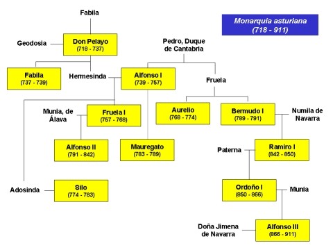 | MONARQUÍA ASTUR-LEONESA (718 - 1037) Una dinastía de 12 reyes descendientes o emparentados con Pedro, Duque de Cantabria, que gobernaron el pequeño reino de Asturias y sobrevivieron con éxito a las numerosas expediciones mulitares que los gobernadores y emires Omeyas lanzaron contra ellos para destruirles. Finalmente, tras dos siglos de luchas contra los musulmanes, el reino de Asturias llegó hasta las orillas de Duero en época del rey Alfonso III El Magno, dando origen a un nuevo reino que fue gobernado durante ciento cincuenta años por otros 12 reyes, hasta que se unió al reino de Castilla por primera vez bajo Fernando I en 1037. |